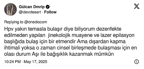 Burcu Akdağ’a, herkesin merak ettiği “Tuvaletten HPV kapılır mı?” sorusu soruldu. Bu türlü bir şeyin olmadığını söyleyen Akdağ “Bu tuvalet olayı, genelde ilgileri yok etmemek için biz tabiplerin kimi vakit başvurduğu temiz bir palavradır.” dedi.
